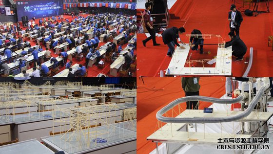 在决赛现场,经过历时两天,共计18个小时的限时集中模型制作,各队完成了结构各异、制作精美的模型。在加载阶段,有40余支高校的模型垮塌,未能通过加载。我校参赛队伍前期准备充分,现场发挥沉稳、模型制作精良,最终通过50千克水加载测试,荣获三等奖。